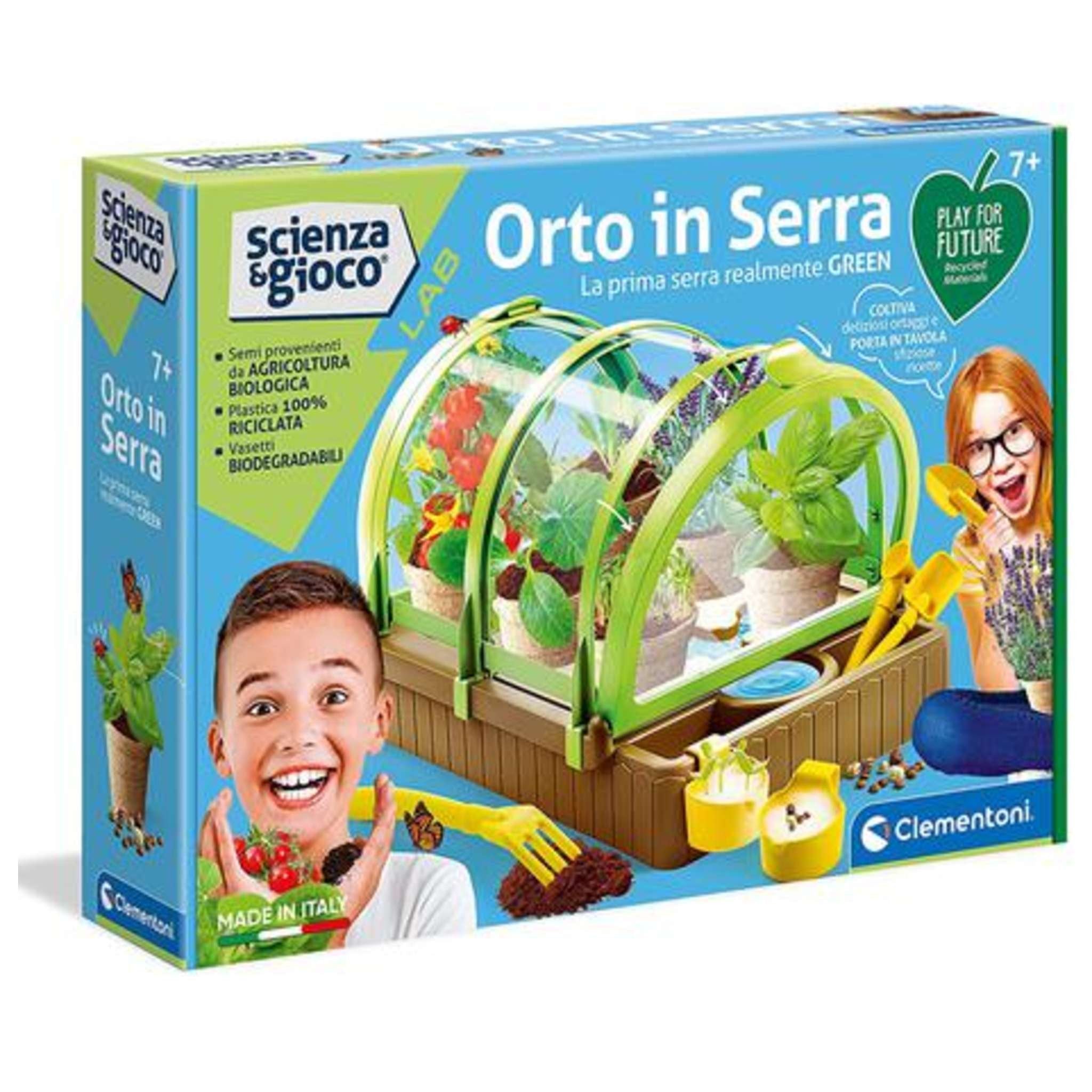 Una nuovissima serra con un moderno design per scoprire i segreti della coltivazione biologica!Realizzata completamente in plastica riciclata, con vasetti biodegradabili e sementi biologiche e un nuovo sistema di apertura semplice ed efficace per garantire il giusto habitat alle piantine.Con un kit completo di strumenti e degli speciali vasetti appendibili per la germinazione che aiuteranno il bambino nella semina e nella coltivazione delle piante!Il manuale scientifico accompagna il bambino alla scoperta dei segreti dell'agricoltura biologica... per diventare super esperto di botanica!I prodotti Play for Future nascono con l'intento di trasmettere ai bambini il valore della sostenibilità e l'importanza del rispetto per l'ambiente attraverso il gioco.