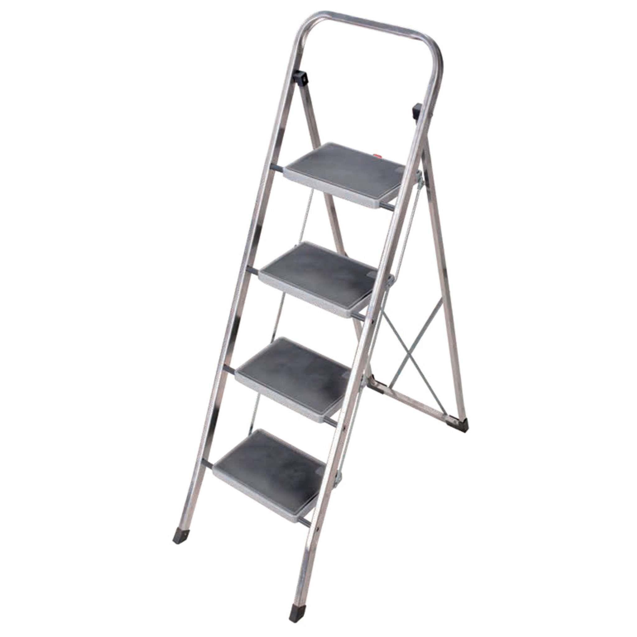 in alluminio solido e leggerissimo a 4 gradini. Gradini 30 x 20 cm ricoperti in gomma antiscivolo. Blocco di sicurezza dei gradini. Piede anteriore posteriore anti scivolo. Montanti davanti 35 x 20 mm - retro 30 x 20 mm. Chiuso occupa soltanto 4 cm. Altezza piattaforma 92 cm. Aperta a forbice 47 x 82 x h 127 cm. Altezza chiusa 142 cm. Portata max 150 kg. Peso 5,1 Kg.